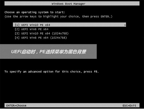 2、UEFI/Legacy启动方式的选择,对后续安装系统的时候影响比较大,一般情况下,如果需要用EFI方法安装系统(硬盘分区表为GPT),就启动UEFI的PE。如果用传统方式安装系统(硬盘分区表为MBR),就Legacy启动方式启动PE,这个按照您自己的需求选择。如果不清楚的话可随意先进一个,如果后面遇到问题再回来重选即可。如果是只支持Legacy启动的老机器,那就没得选,只能以