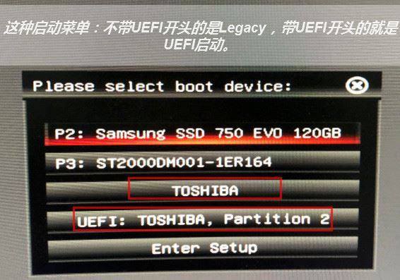 当您的机器支持UEFI的话(新机器一般同时支持Legacy和UEFI),在这个启动项中一般会出现两个U盘的选项,一个是UEFI开头的,另一个是不带UEFI开头的或叫Legacy的: