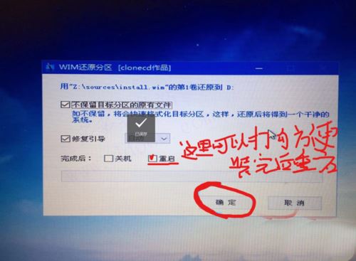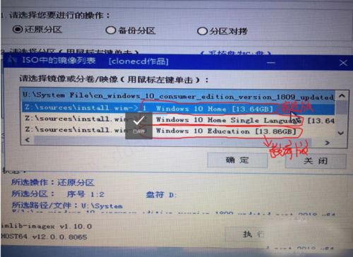 10、返回到桌面打开CGI备份还原,选中C盘,然后在下面选择浏览镜像,在U盘里面找到系统,例如途图中我选择的是Win10 家庭版,选择好版本后点击确定,建议大家把完成后重启打勾,装完后直接就会进入新的系统了,就相当于你刚买的新电脑开机那样的界面