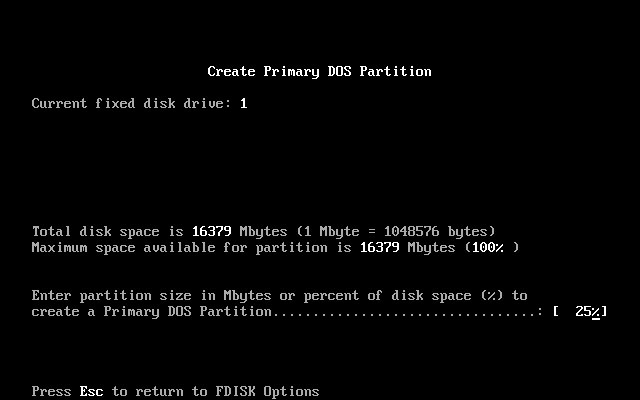 这里要输入准备分配给主分区的容量,可输入大小***MB,也可用%输入。我准备平均分配硬盘容量为4个分区。因此在这里我输入“25%”,如下图10所示。