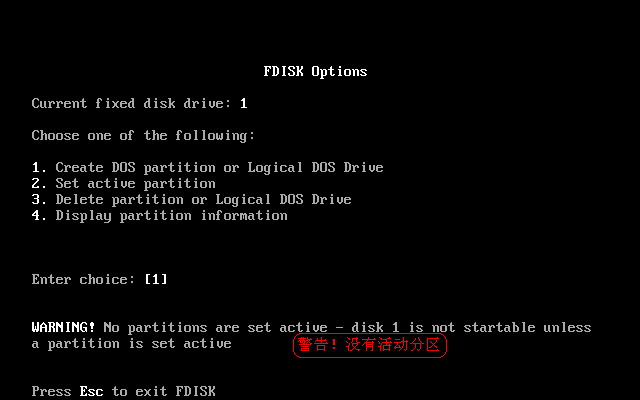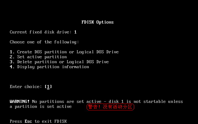 上图中,“警告!没有活动分区”。现在应该设置活动分区了。输入“2”选择第2项(设置活动分区),如下图28所示。