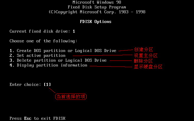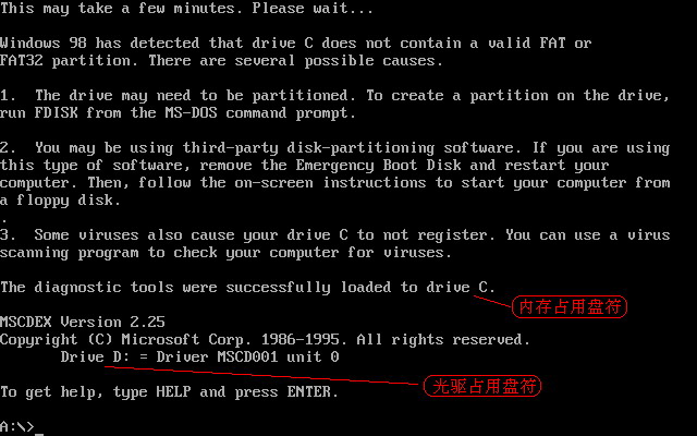 安装好新买的硬盘或清空了分区表的硬盘后,用98启动盘启动系统进入DOS后,出现如下图1所示。
