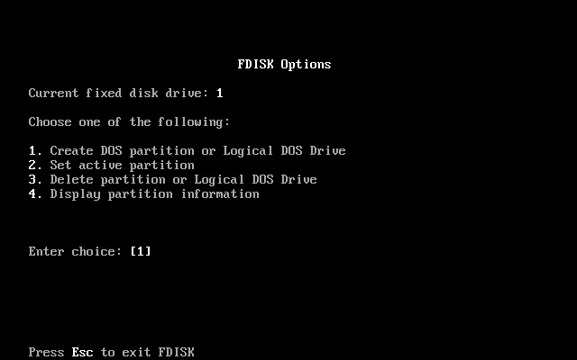 上图可见,因为没有可用的硬盘,所以内存占用盘符为C盘,光驱占用盘符为D盘。在提示符“A:\>_”下输入“fdisk”后按Enter回车键打开fdisk程序,出现如下图2所示。