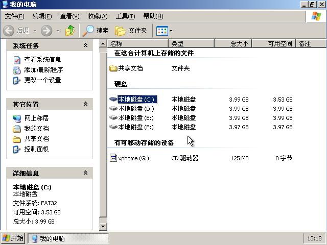 就行了(前提是启动盘中有format.com命令),但不能使用快速格式化。 如果要安装XP系统并把分区格式化为NTFS文件系统,最好用XP安装光盘启动安装,在安装过程中格式化,这样得到的NTFS分区要比安装系统后从FAT32转换而成的NTFS分区好。 我把各分区格式化为FAT32文件系统后,安装了XP系统,打开“我的电脑”显示如下图36所示。