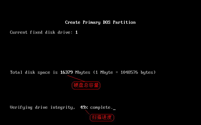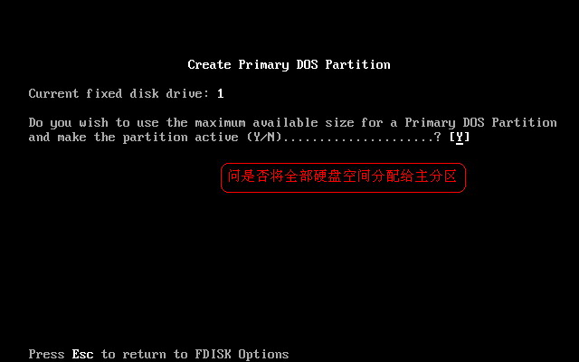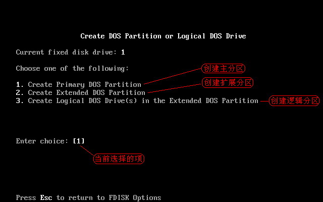 这里有三个选项,各项选项的作用如上图红线指示。选第1项(创建主分区)后,按Enter回车键后,出现如下图5所示。