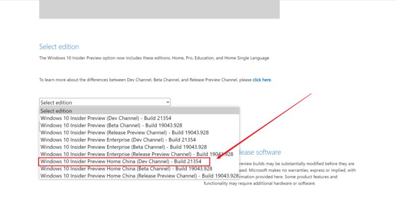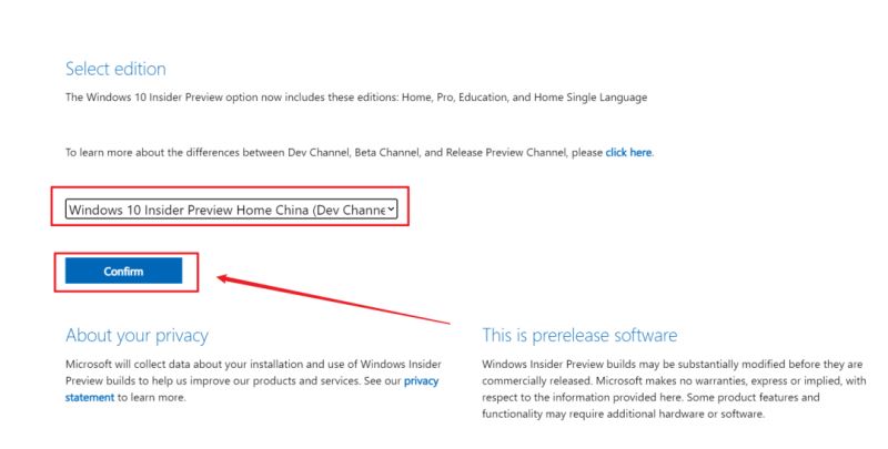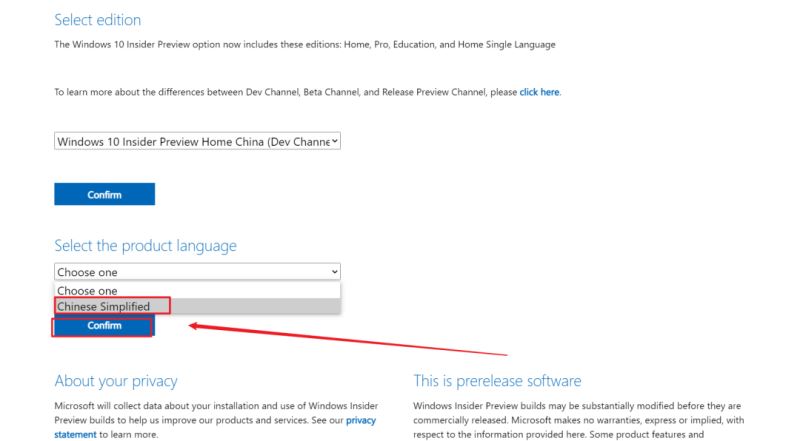 打开链接后,在网页末尾可以选择下载的系统的类型。在这里建议选择【Windows10 Insider Preview Home Chine(Dev Channel )-Build】选好了之后点击【Confrim】: